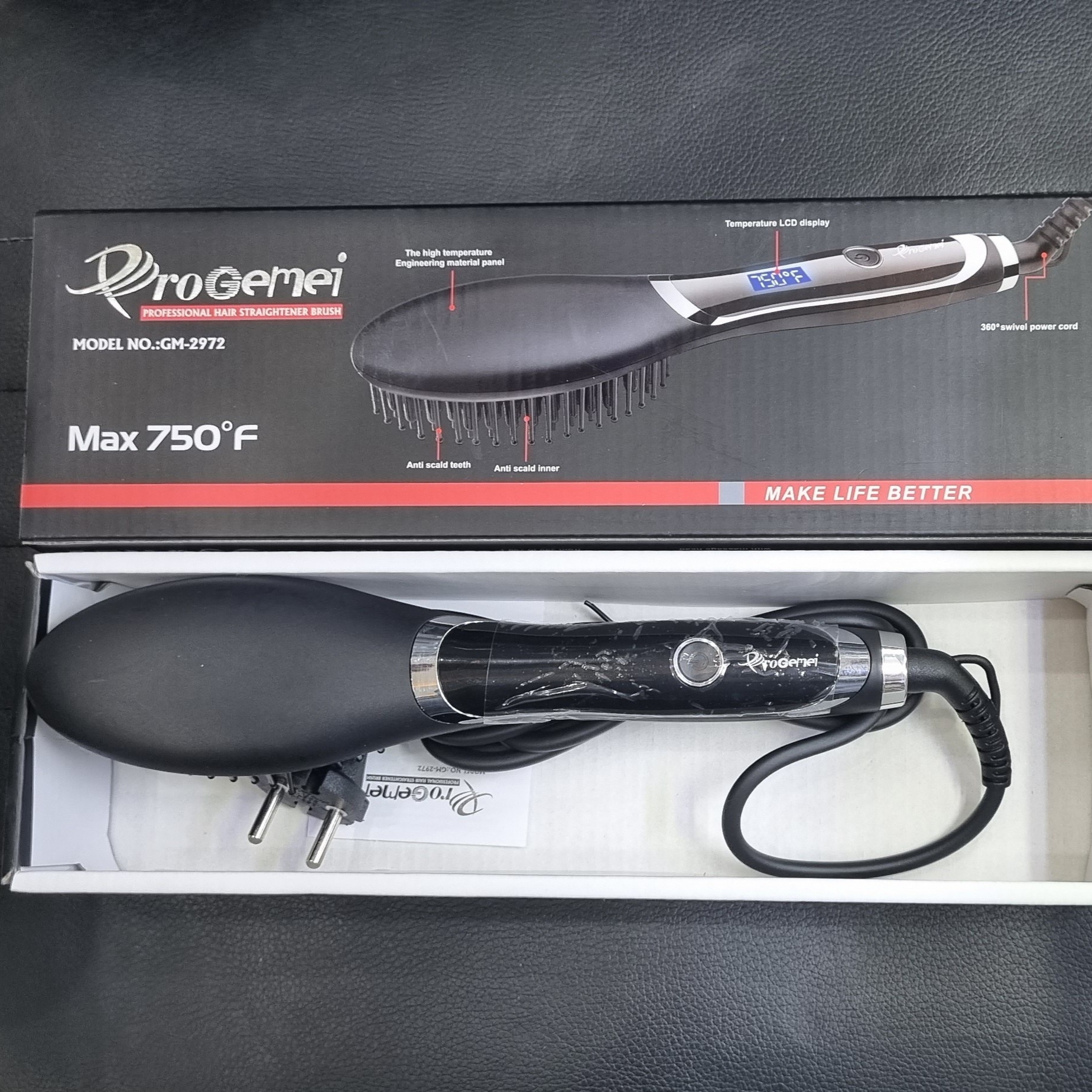 برس حرارتی proGEMEI مدل GM-2972 در حقیقت مدل پیشرفته می باشد. بیشینه ی دما در این برس حرارتی تا 750 درجه فارنهایت معادل 400 درجه سانتی گراد می رسد که به لطف این حرارت می توان موهای سر را 5 برابر سریع تر از برس های حرارتی معمولی صاف کرد و یکی از بهترین برس های حال حاضر می باشد.یکی از ویژگی های بارز این برس حرارتی فناوری تولید یون است که کمک می کند موهای سر در حداقل زمان خشک شوند. در ساخت این برس حرارتی از ماده ای استفاده شده است که از موهای شما در برابر آسیب های گرما محافظت می کند. برس حرارتی جیمی مدل GM-2972 دارای یک پوشش پانل سرامیکی است. همچنین این برس حرارتی بصورت ارگونومیک طراحی شده است بطوری که دستگاه در دست کاملا پایدار است. به وسیله ی این برس حرارتی می توانید موهای صاف و براقی داشته باشید.بر روی بدنه ی این برس حرارتی یک نمایشگر LCD قرار داده شده است که شما با استفاده از آن درجه دستگاه را بسته به نوع موی خود تنظیم کنید.